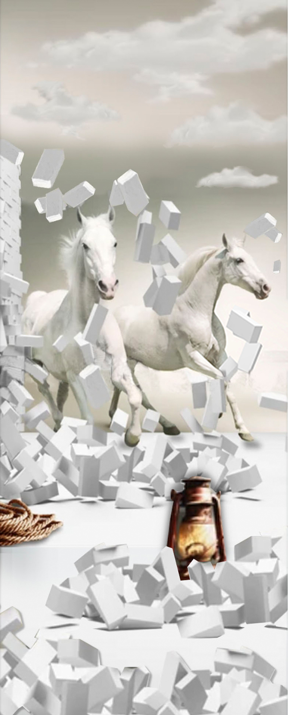 3D Illustration Of White Horse Coming Out From Broken Bricks