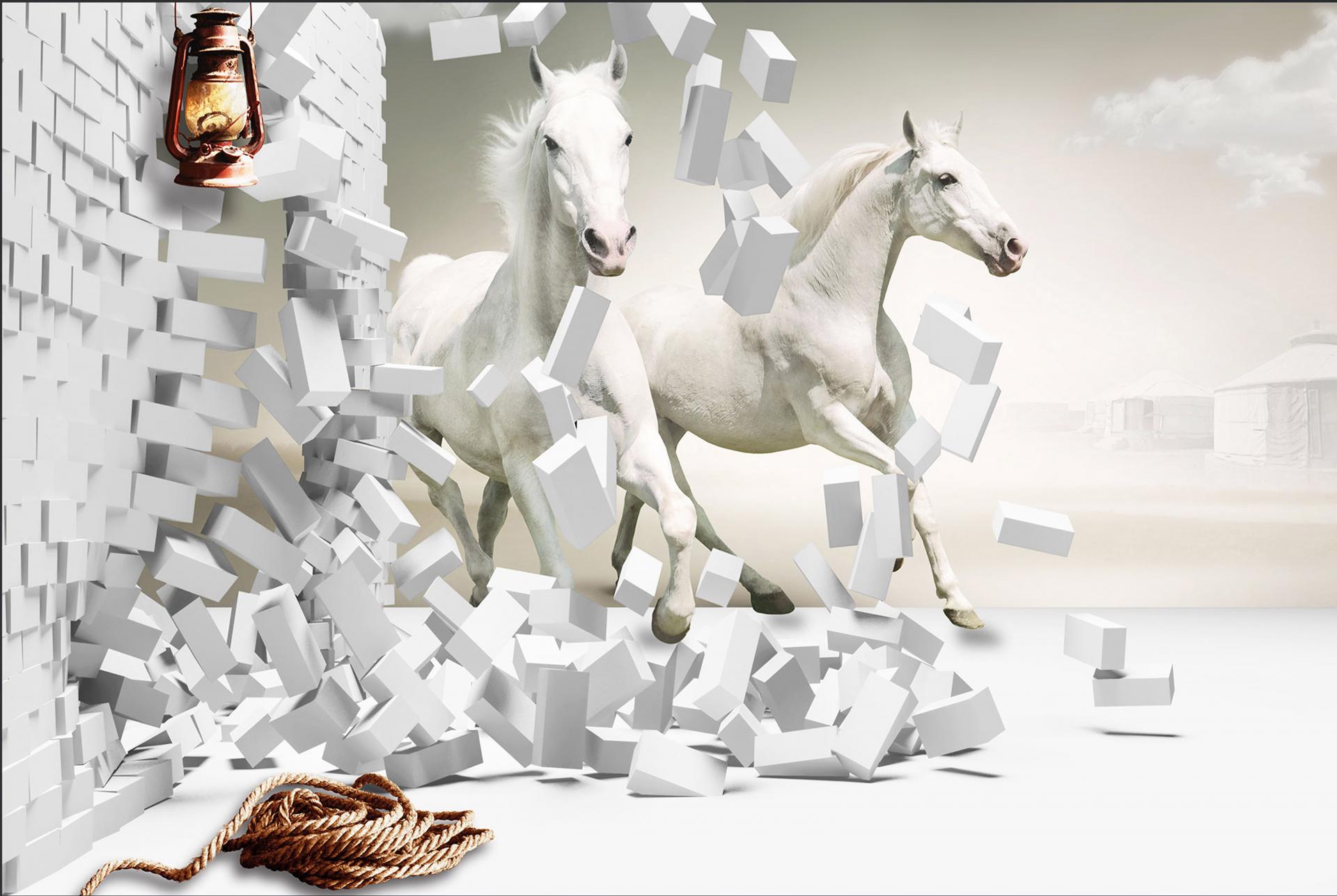 3D Illustration Of White Horse Coming Out From Broken Bricks