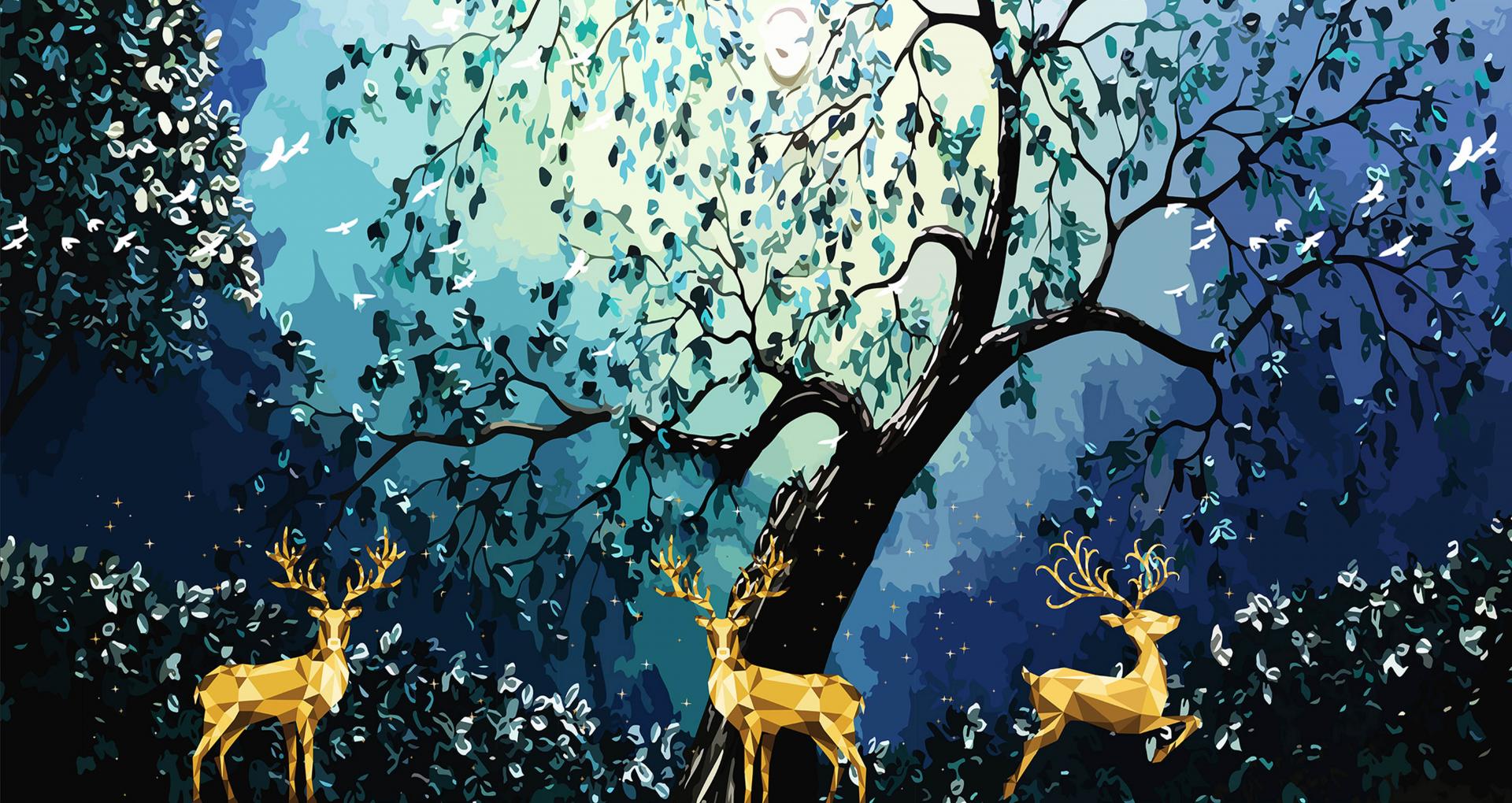 3d Modern Art Golden Deer, Black Christmas Tree With White Birds