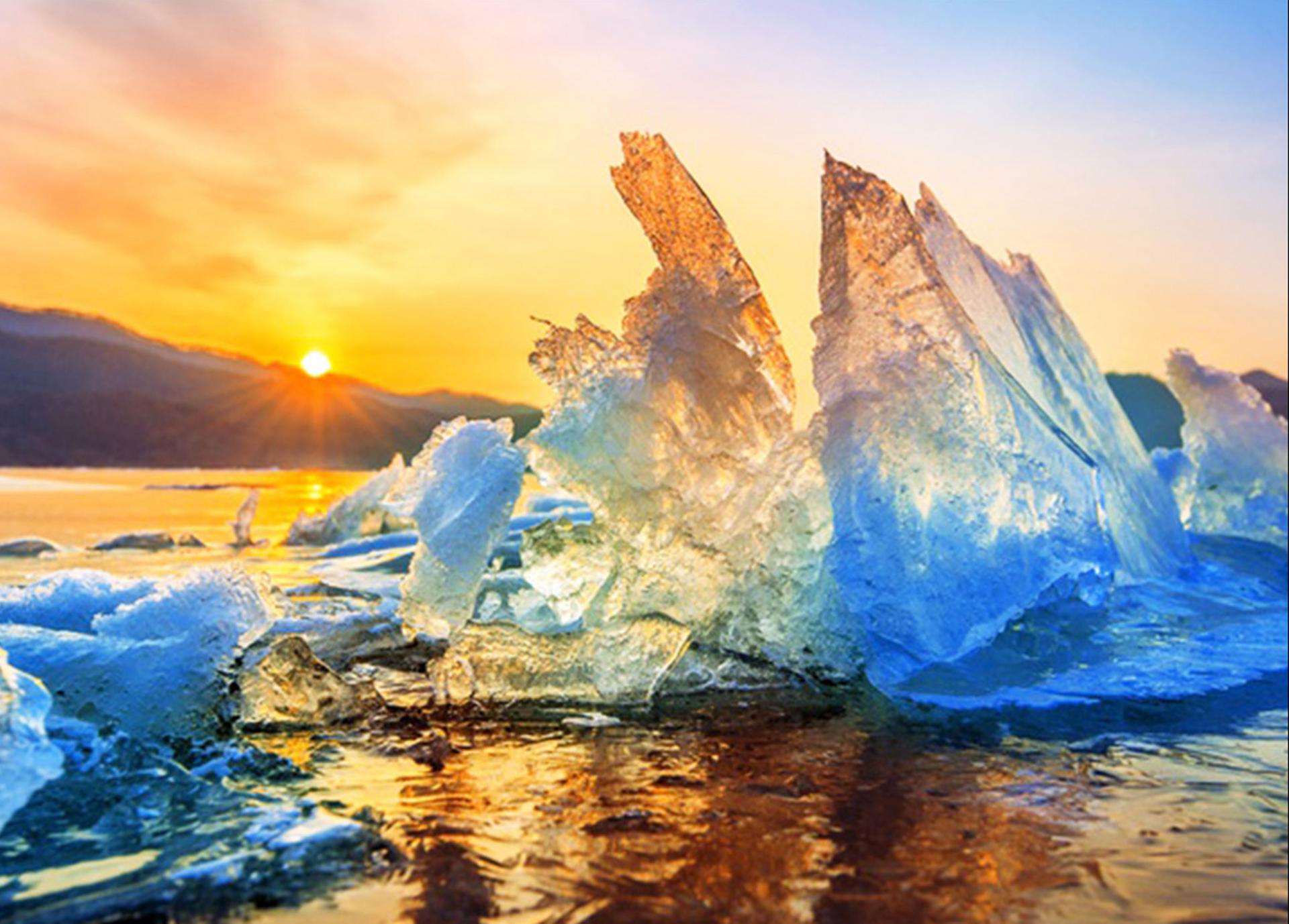 Very Large And Beautiful Chunk Of Ice At Sunrise In Winter